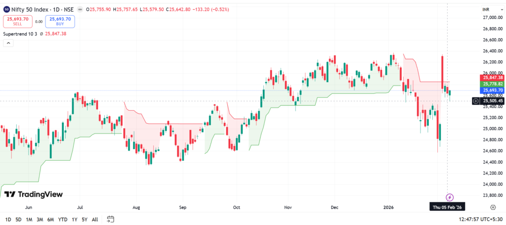 Let’s begin with the Supertrend indicator, which is widely used in intraday trading to identify market direction. This indicator is displayed directly on the price chart and helps traders understand whether the current trend is bullish or bearish based on its position relative to the price.